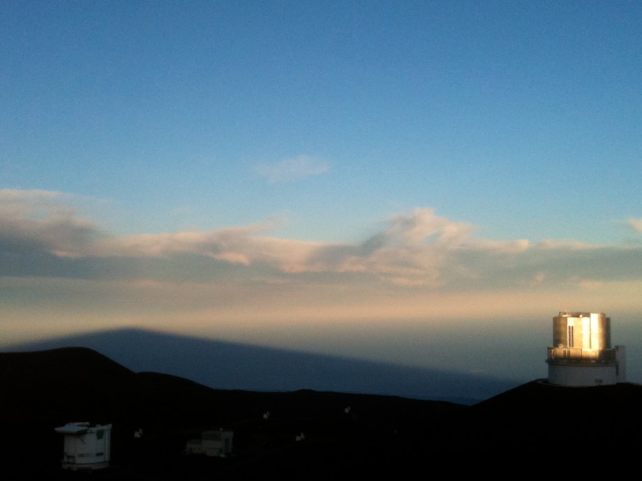 An amazing but exhausting day. Sea level to 14,000 back down to sea level then all the way back around the Big Island (which really did seem big after all that driving). Have to share a few highlights for me. I’ve never seen the moon so bright or so close. We had to squint when looking at it like you would looking at the sun. Next was seeing the glow of lava inside the Kilauea crater thousands of feet below us and half an island away. Seeing and hearing the telescopes operating with their eyes to the sky was also pretty cool. The sunrise over the Pacific was spectacular. But the most memorable sight of the day was seeing the shadow of Mauna Kea cast by the rising sun out over the ocean. Totally surreal. Had to share a photo.