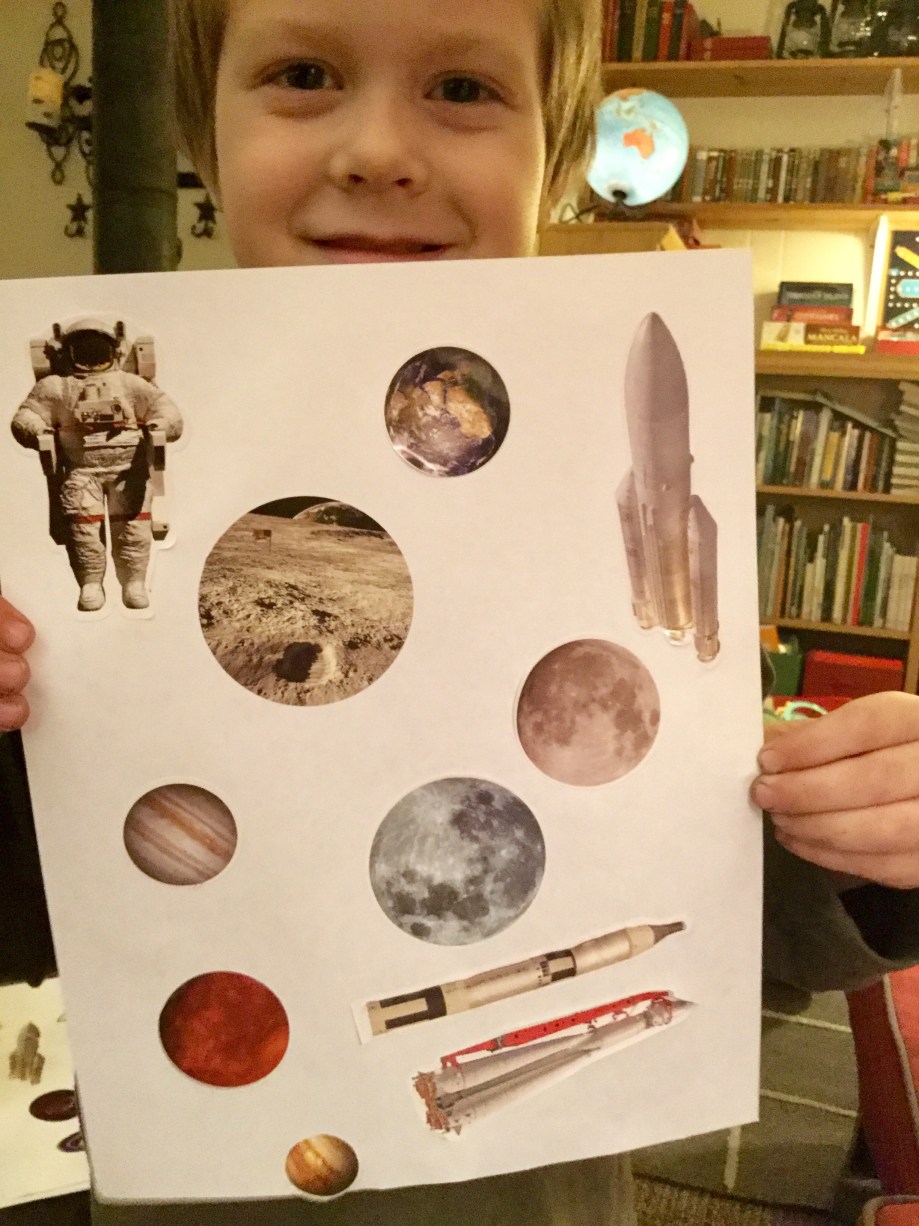 My favorite part about astronomy is looking at the moon. We look at it in our telescope and it has lots of bumps. The moon goes around the earth and the earth goes around the sun and the sun goes around nothing I think. And people have gone around the moon and people have gone on the moon. But Andrew says they didn’t. Here is my sticker picture that I made about the moon and about the earth and about space shuttles and I don’t want to go on one (dictated to Mom by Gideon, 5).
